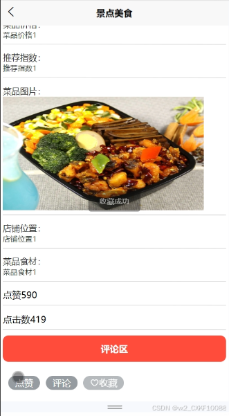 (7)景点美食:用户可以查看自己感兴趣的景点美食信息,可以进行点赞评论和收藏。