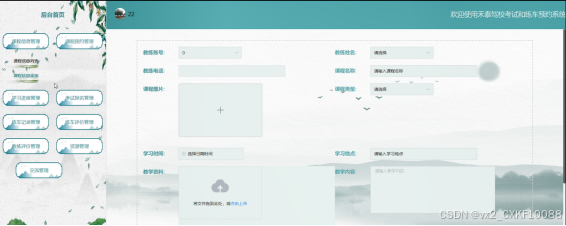 (2)课程信息管理:用户点击可查看课程信息列表和课程信息添加;点击“课程信息添加”,选择教练账号、价教练姓名,输入教练电话、课程名称,上传课程图片,选择课程类型、学习时间,输入学习地点,上传教学资料和输入教学内容,点击”提交“按钮进行添加。