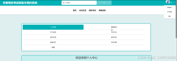 个人中心:用户点击头像可查看“个人中心”,包括个人首页、课程预约、学习进度、考试报名、练车记录、练车评价、教练评价、论坛列表和收藏。界面图如下。
