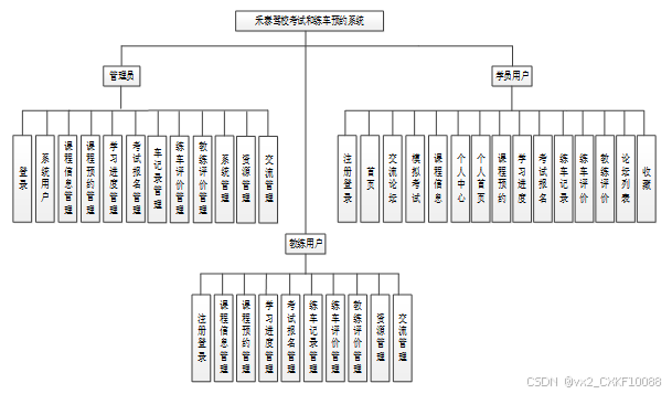 系功能模块的设计就是把系统具体要实现哪些功能,功能如何划分做一个系统的架构,以模块图的方式展示出来,方便我们进行功能得罗列以及涉及。在系统的功能方面,项目分成了管理员+教练用户+学员用户三个模块,每个模块登录进去对应相应的功能,具体的功能模块图如图3.1所示。