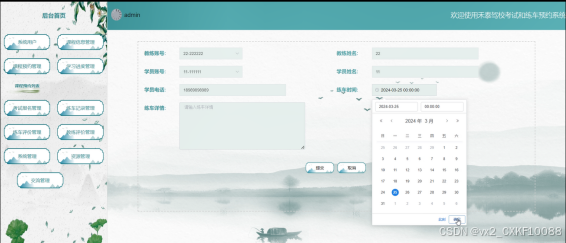 (4)课程预约管理:管理员点击查看课程预约列表,同时可点击“练车”按钮,选择练车时间和输入练车详情,点击“提交”按钮进行添加课程预约。