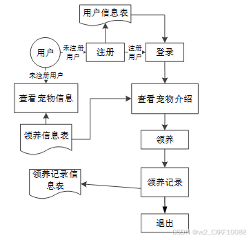 分析完宠物领养及健康管理系统的数据流,那么接下来我们来看系统的业务流程,系统业务流程图如下: