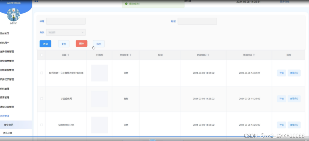 当点击“资源管理”这一菜单的时候,会出现宠物资讯、资讯分类这两个子菜单,可以对这两个模块进行增删改查操作。资源管理界面如下图所示。