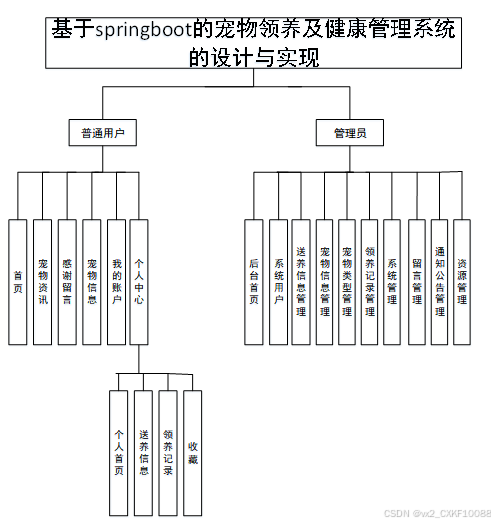 宠物领养及健康管理系统主要划分为了普通用户管理模块和管理员管理模块这两大部分,具体功能描述如下: