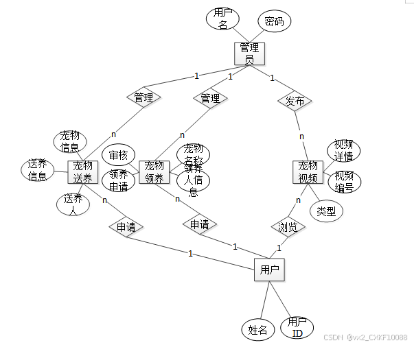 下面是整个宠物领养及健康管理系统中主要的数据库表总E-R实体关系图。