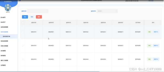当点击“宠物信息管理”这一菜单的时候,会出现宠物信息列表这个子菜单,通过输入宠物名称、宠物类型进行查询、重置和删除等操作。宠物信息管理如下图所示。