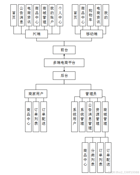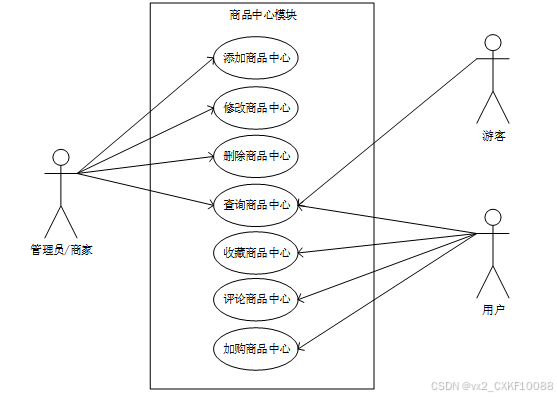 (1)商品中心模块:本多端电商平台主要的功能之一是可以购买商品,所以系统中需要管理员和商家用户添加各种电商商品信息供用户查询,购买,管理员和商家用户在此模块主要是对商品中心信息的增删改查,游客实现对商品中心的查询,普通用户则实现商品中心的收藏、评论、加购、立即购买等操作。如下图2-4所示。