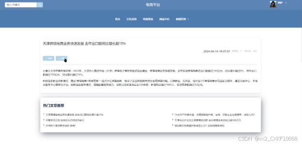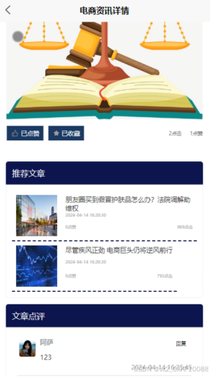 (2)电商资讯模块:管理员在后台可以对电商资讯及其分类进行增删改查,游客实现查看电商资讯,用户进行收藏、点赞、评论。如下图2-5所示。