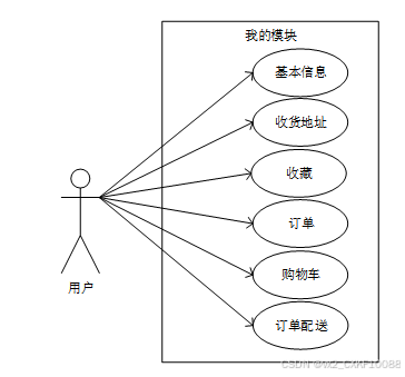 (6)移动端我的模块:我的模块是用户独有的功能,可以在“我的”管理基本信息、收货地址、收藏、订单、购物车、订单配送,我的用例如下图2-9所示。