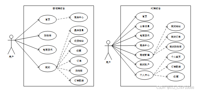 多端电商平台前台用户在移动端和PC端的电商平台都可以进行登录,其用户主要功能是对系统信息的查看、收藏、评论,对商品信息的查看以及对电商商品的购买,购买的过程中需要对收货地址进行设置,对购物车进行管理,查看自己的订单等。前台普通用户用例图如图2-10所示。