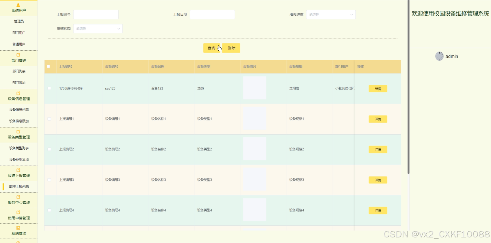 故障上报管理:系统用户点击“故障上报管理”可以查看故障上报列表、审核、详情,进行删查。