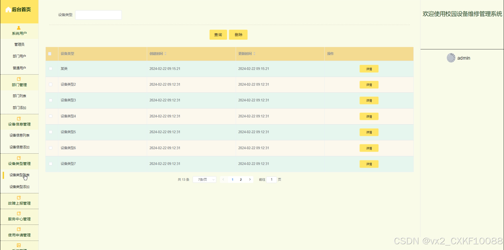 设备类型管理:系统用户点击“设备类型管理”可以查看设备类型列表、添加、详情,进行增删改查。