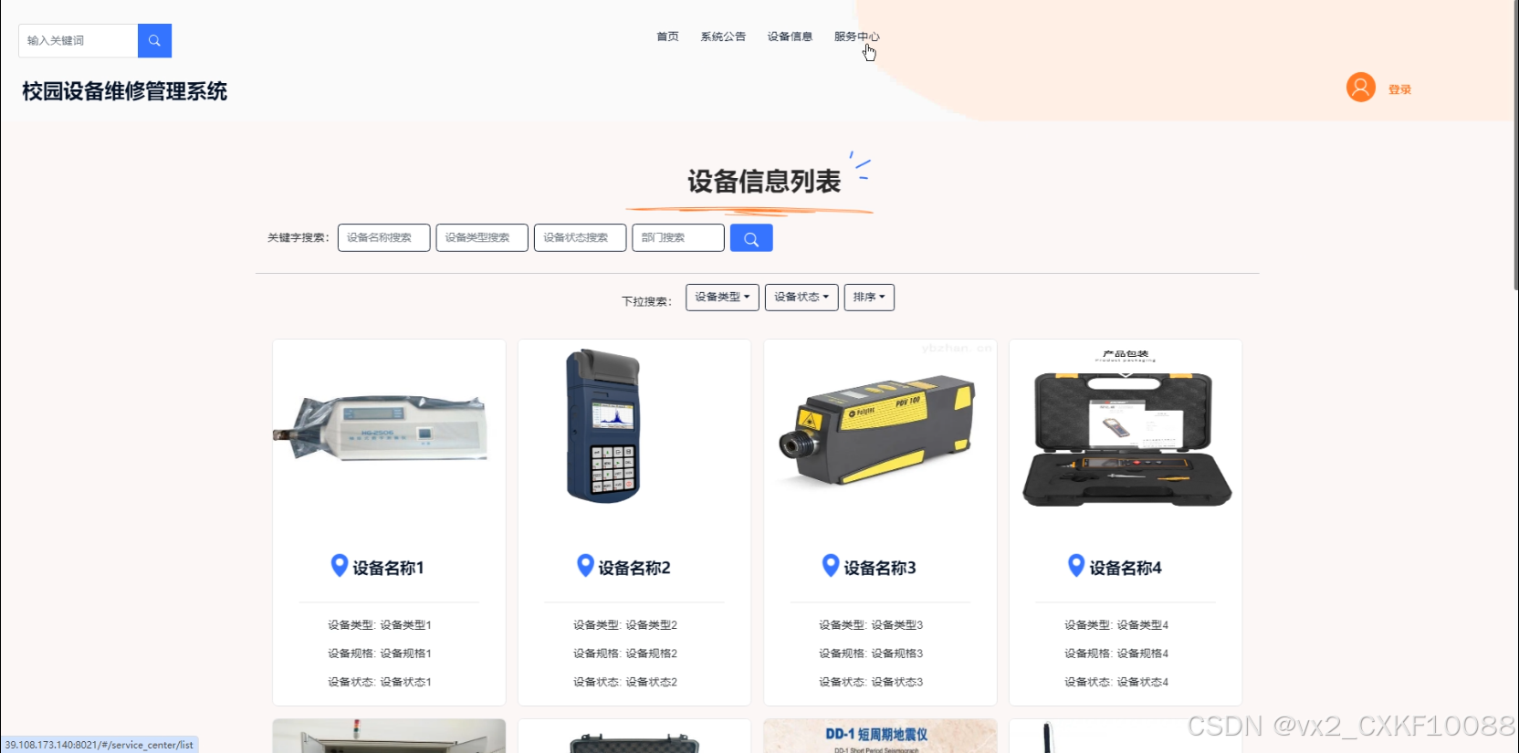 设备信息:当普通用户点击“设备信息”这一菜单按钮,会显示所有设备信息列表包括设备名称、设备类型等。支持通过搜索关键词的方式对设备信息进行查询,可以进入查看详细的介绍,在设备信息详情这个界面,支持用户对设备信息进行故障上报、使用申请、收藏以及评论的功能。