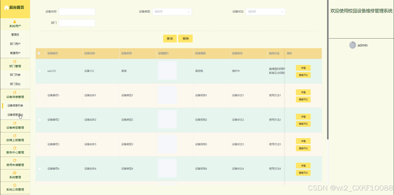 This design mainly implements a campus equipment maintenance management system that combines the advantages of humanization, high efficiency, and convenience. It completes functional modules such as homepage, personal center, equipment information management, equipment type management, fault reporting management, service center management, usage application management, system management, and system announcement management. The system communicates with the server through a browser to achieve data exchange and change. This system improves work efficiency and reduces errors and omissions in data storage through scientific management and convenient services.