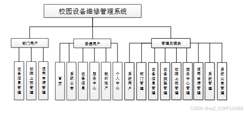 校园设备维修管理系统在对需求做解析后,整个系统主要分为三个部分:管理员、普通用户、部门用户,每个模块下的分支功能不一样。对功能做出如下说明: