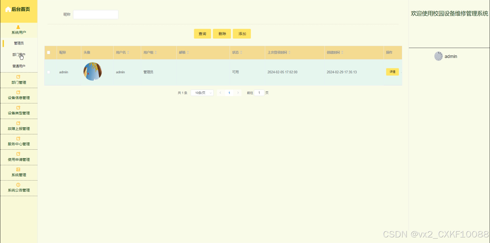 系统用户:系统用户点击,可以展示管理员、普通用户,部门用户进行增删改查