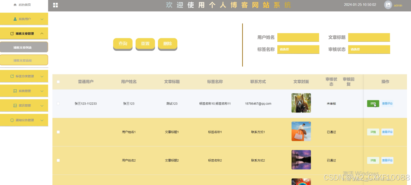 - 博客文章管理:管理员可以对博客文章进行查询、重置、添加和删除操作。