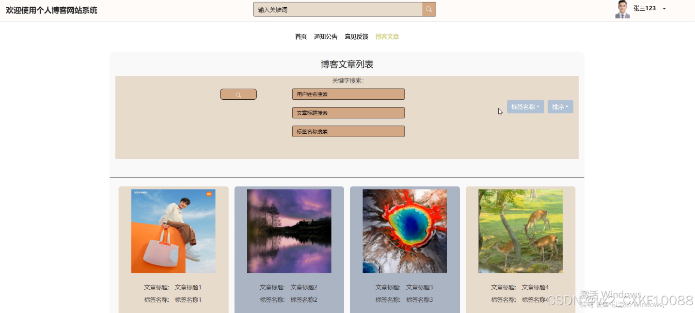 - 首页:普通用户可以查看首页展示的轮播图、博客文章、通知公告等信息。
