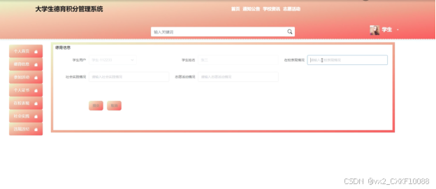 学生用户可提交自己的德育信息,包含在校表现情况、社会实践情况、志愿活动情况等信息。其界面如下图4-10所示。