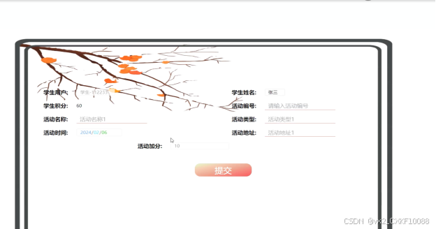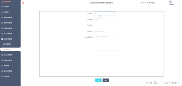在校表现管理界面是为学生用户设计的一个界面,用于方便管理和记录学生的在校表现情况。该界面包括学生姓名、学生积分、表现加分和在校表现情况等重要信息。学生姓名字段显示学生的姓名,学生积分反映学生的综合素质和表现水平,表现加分记录额外奖励的积分,而在校表现情况提供全面评估学生的学业成绩、参与活动热情度和纪律遵守等方面的表现。界面如下图4-13所示。