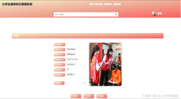 (4)志愿活动:系统提供志愿活动的信息发布和报名功能。学生可以浏览已发布的志愿活动,了解其内容、时间和地点,并进行在线报名参与。学生可以选择自己感兴趣的活动,进行点赞、收藏及评论。