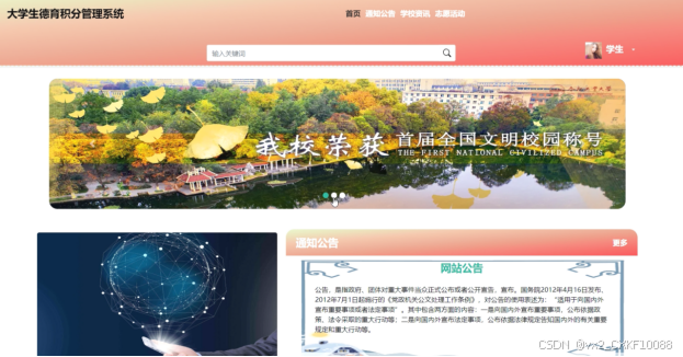 (1)首页:学生登录系统后,进入个性化的首页。该首页应提供简洁明了的界面,展示学生的个人信息、德育积分总览以及最新通知和重要动态。学生可以快速浏览学校的最新消息和即将到来的活动,以便及时了解和参与。