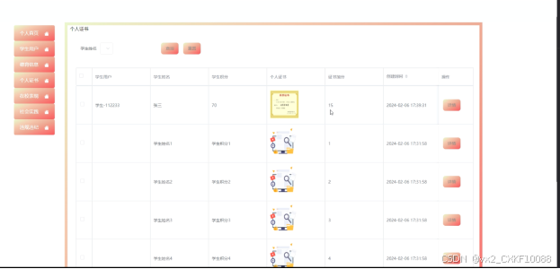 个人证书:教师可以查看和管理学生获得的个人证书,如荣誉奖状、参与证明等。