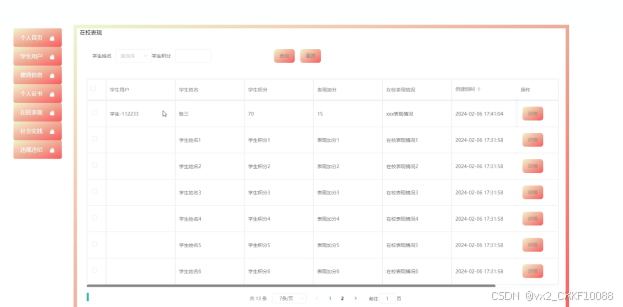 (7)在校表现管理:管理员能够查看学生的在校表现,包括学生用户、学生姓名、学生积分、表现加分、在校表现情况等。