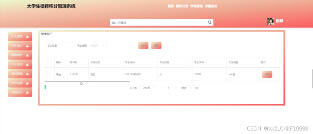 学生用户:教师可以查看和管理自己所负责的学生用户。他们可以了解学生的基本信息、德育积分情况、活动参与记录等,为学生提供个性化的指导和支持。