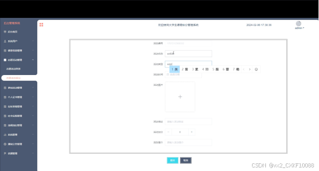 活动添加管理界面是一个用于方便管理活动信息的用户界面。它包括活动编号、活动名称、活动类型、活动时间、活动图片、活动地址、活动加分和活动简介等重要信息。通过这个界面,管理员可以轻松地添加、编辑和删除活动,并实时跟踪活动的状态和进展。这些信息的收集和显示能够提供清晰而有吸引力的活动信息,提高活动管理的效率和准确性。其界面如下图4-12所示。