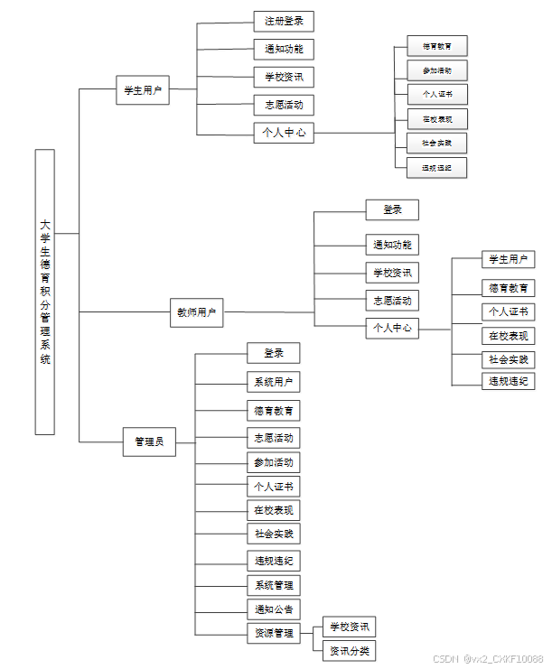 按照C#大学生德育积分管理系统的角色,主要包括学生用户,老师用户和管理员这三大功能模块。