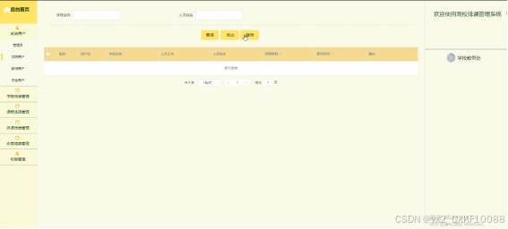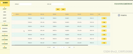 This system is developed with practical application as its background. Through the system administrator, all students, teachers, college personnel, and related course and scheduling data information related to students can be uniformly managed, facilitating the retention of information. Teachers and students can register and log in to the system to query and manage information such as colleges, courses, scheduling, and school notifications. Overall, the front-end of the system is displayed through JSP pages, the back-end uses the Spring Boot framework, and the database uses the popular open-source relational database MySQL. This system uses the currently popular Vue.js technology in the front-end, making the page display more neat and beautiful.