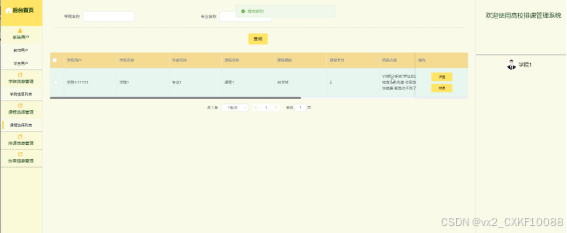 学院用户点击“课程选择”这一菜单按钮,会显示管理员在后台发布的所有的课程选择,可以查看详情,进行增删改查等操作;界面如下图4.5所示。