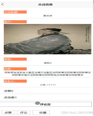 (4)古诗信息:用户点击“古诗信息”菜单可以查看所有古诗信息,可以按照条件查看古诗信息,或者输入关键词进行查询,点击可以进入古诗信息详细展示界面,在此界面用户可以收藏、点赞和评论。