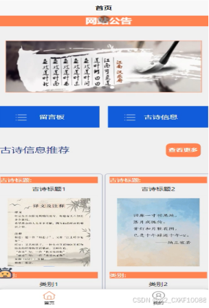 (2)查看诗词app的首页信息:诗词app的首页信息包含了首页、系统公告、古诗信息、留言板等。