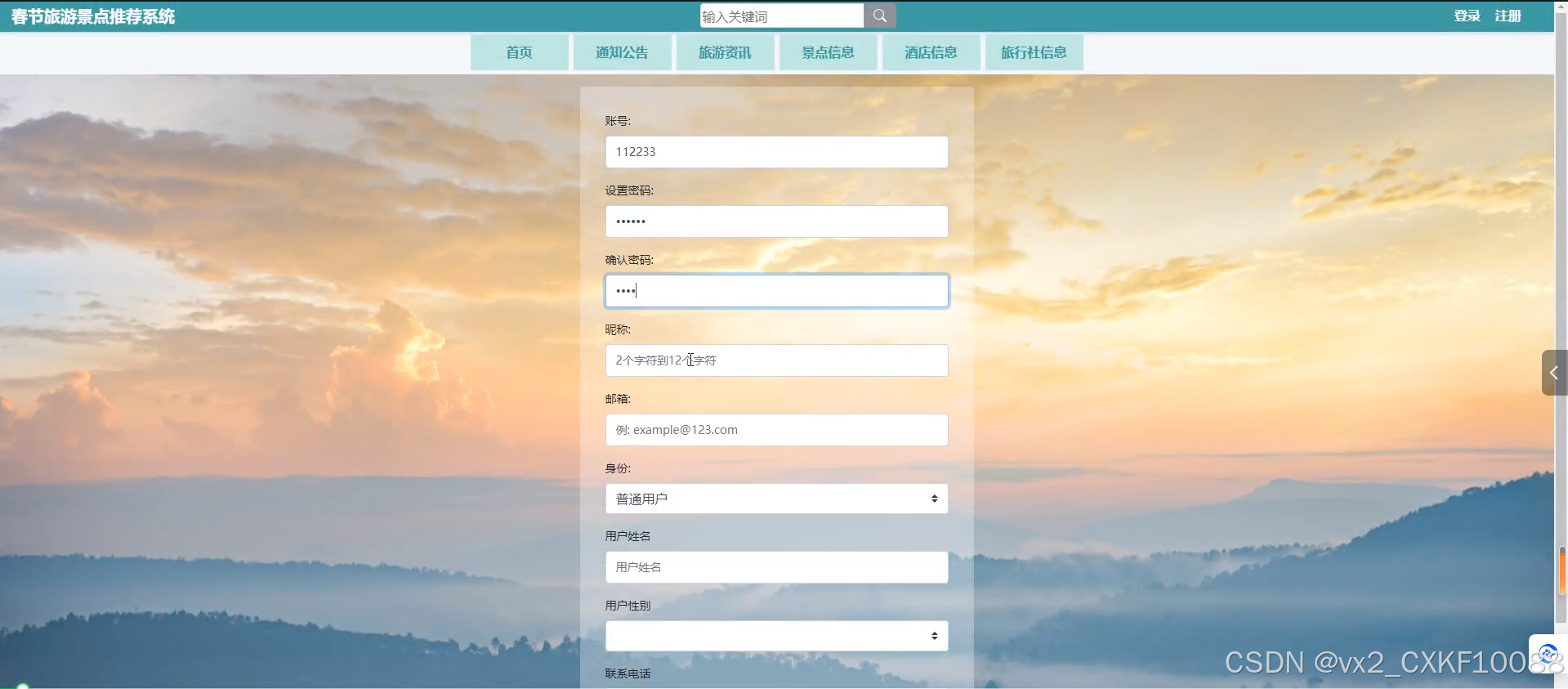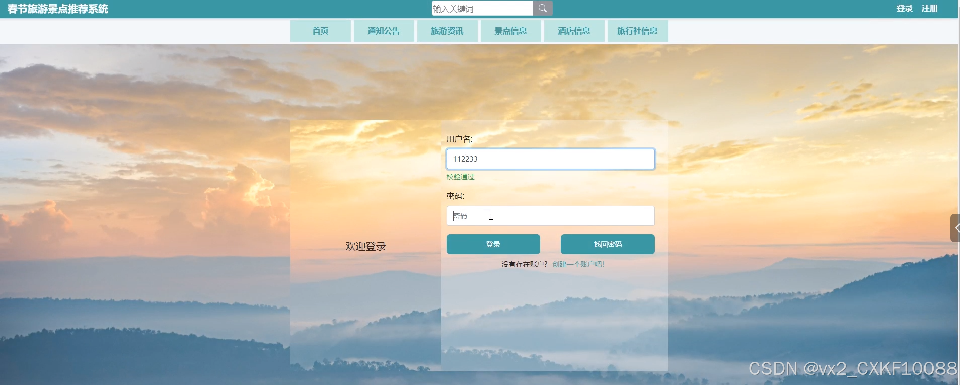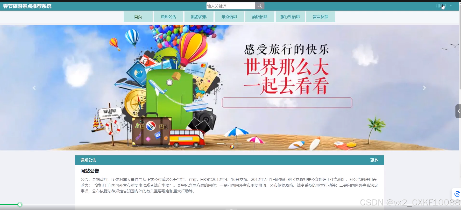 - 首页:用户可以查看系统展示的通知公告、景点信息推荐、酒店信息推荐等信息。