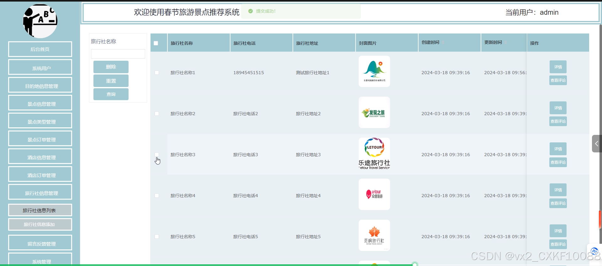 - 旅行社信息管理:管理员可以查看旅行社信息列表中的某一酒店的详情和评论信息,可以对酒店信息进行查询、重置、添加和删除操作。