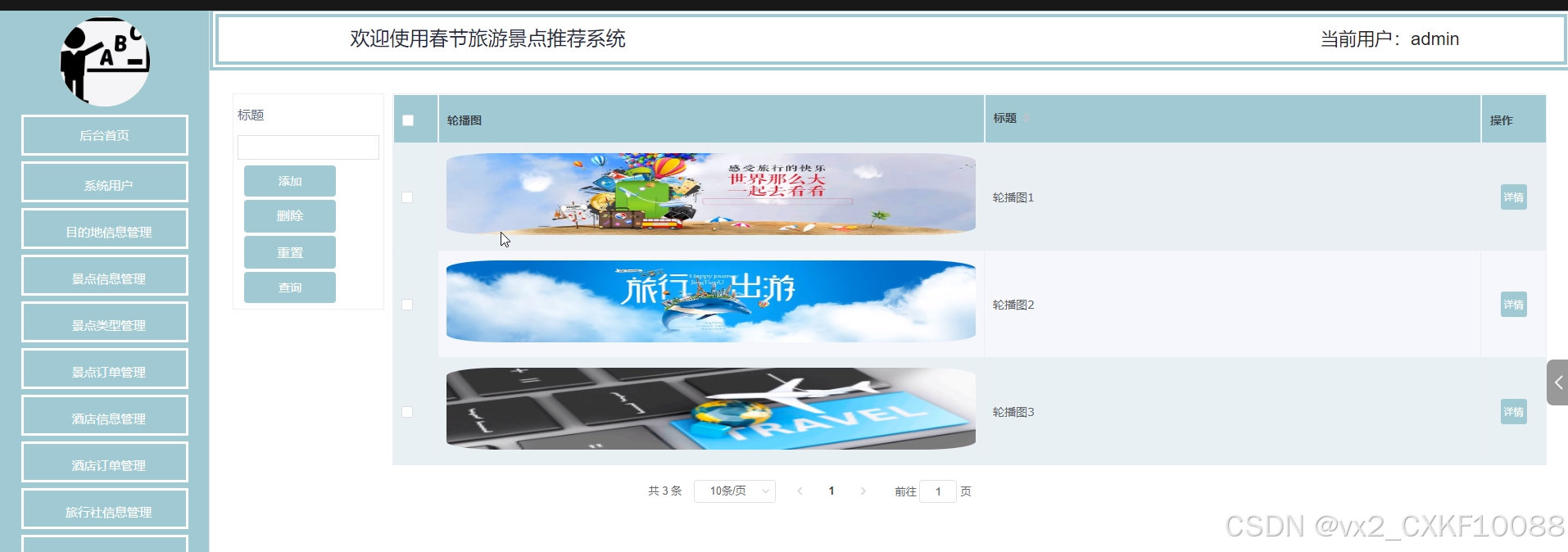 - 系统管理:管理员可以查看轮播图列表中的某一轮播图信息详情,可以对轮播图信息进行查询、重置、添加和删除操作。
