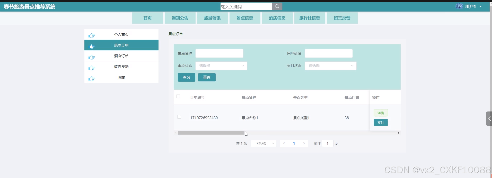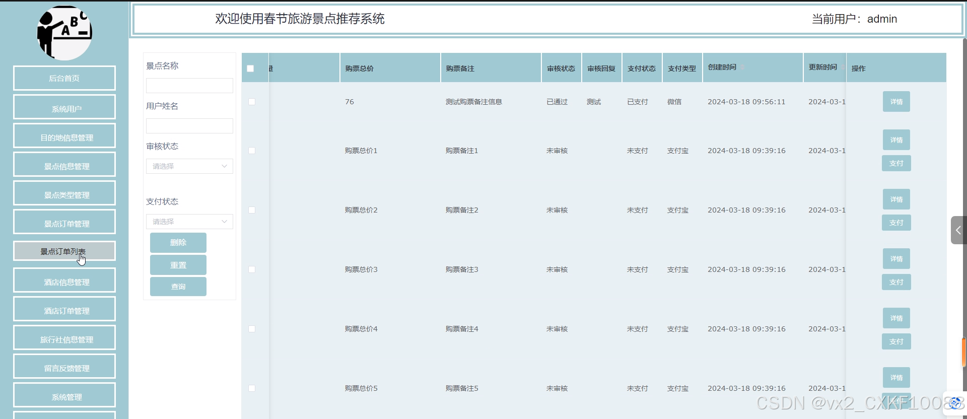 - 景点订单管理:管理员可以查看景点订单列表中的某一订单信息详情并进行审核和回复,可以对景点订单信息进行查询、重置和删除操作。