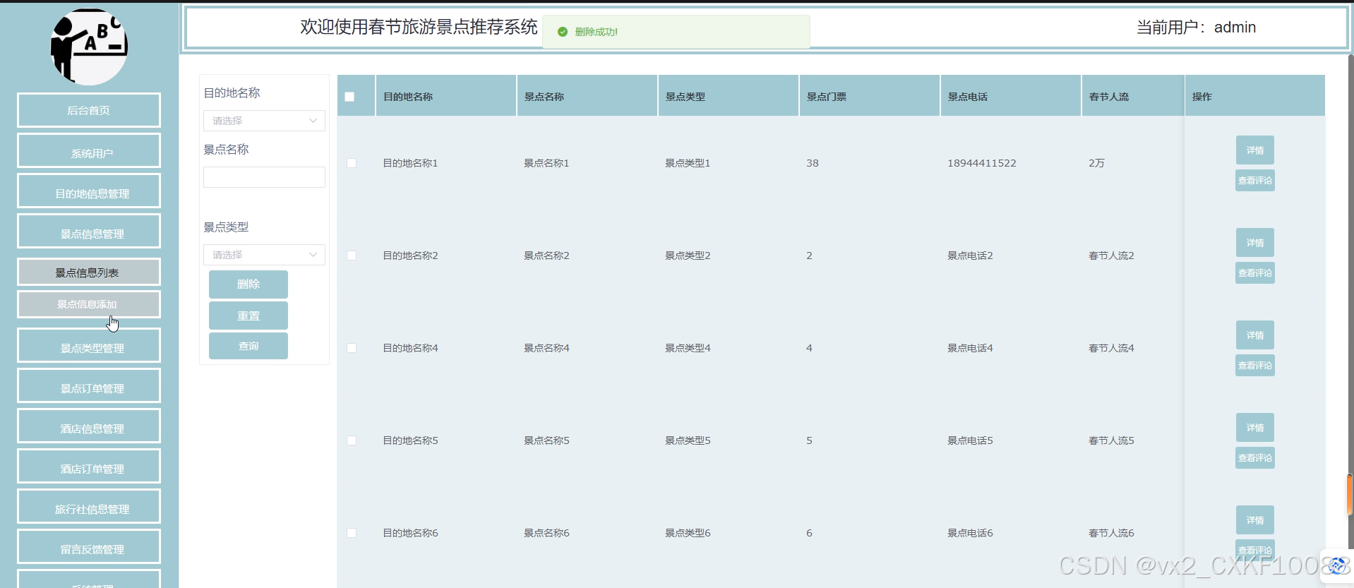 - 景点信息管理:管理员可以查看景点信息列表中的某一景点详情和评论信息,可以对景点信息进行查询、重置、添加和删除操作。