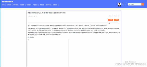 (3)学校资讯:当用户点击“学校资讯”这一菜单按钮,会显示管理员在后台发布的所有的学校资讯,可以查看详情,进行收藏、点赞、评论等;