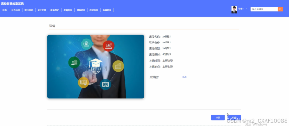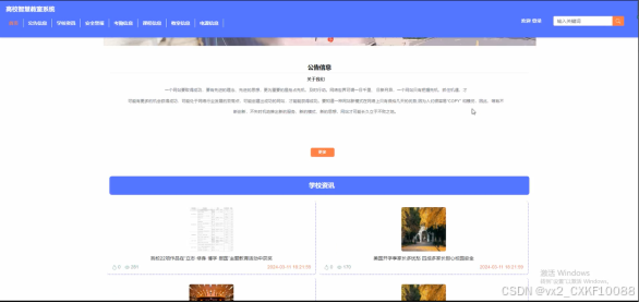 (2)查看高校智慧教室系统的首页信息:高校智慧教室系统的首页信息包含了首页、公告信息、安全警报、学校资讯、课程信息、教室信息、考勤信息、电源信息等。