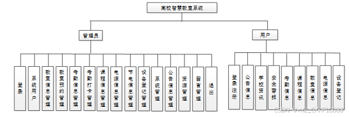 高校智慧教室系统我划分为了注册用户模块和管理员模块这两大部分。