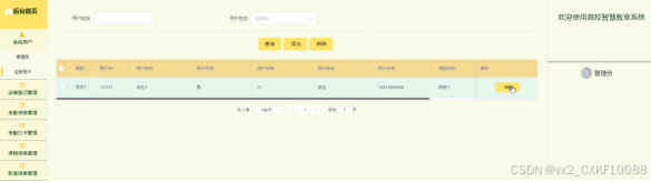 (1)用户管理:管理员可以对系统中的管理员、游客用户进行增加、删除、修改和查询操作,实现对用户角色的有效管理。