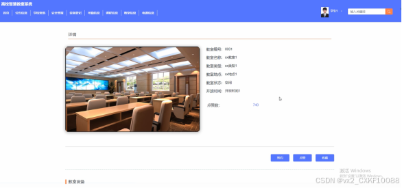 (4)教室信息:当用户点击“教室信息”这一菜单按钮,会显示管理员在后台发布的所有的教室信息,支持通过关键词对教室信息进行搜索,选择需要的教室信息点击可以进入到教室信息详细的介绍界面,在详细界面可以查看到教室的教室编号、教室名称、教室类型、教室地点、教室图片、教室状态等信息,同时可以进行预约、点赞、收藏、评论操作;