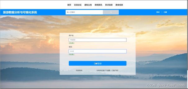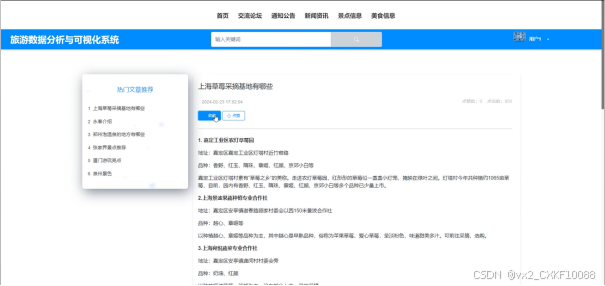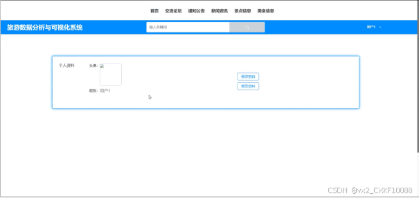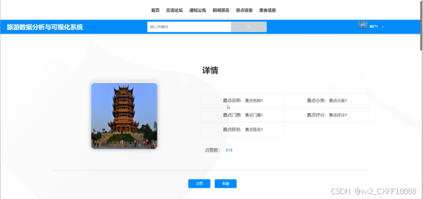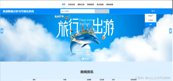 (2)查看旅游数据分析与可视化系统开发的首页信息:旅游数据分析与可视化系统开发的首页信息包含了首页、交流论坛、通知公告、新闻资讯、景点信息、美食信息。