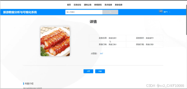 (7)美食信息:用户点击“美食信息”菜单可以查看所有美食信息,可以按照条件查看美食信息,或者输入关键词进行查询,点击可以进入美食信息详细展示界面,在此界面用户可以收藏、点赞和评论,美食为热度推荐、根据用户点击率推荐、最高的排在前面。