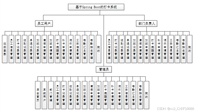 按照基于Spring Boot的打卡系统的角色,主要包括员工用户、部门负责人和管理员这三大功能模块。