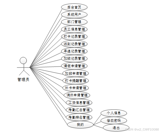 - 管理员功能包括后台首页、系统用户、部门管理、员工信息管理、打卡记录管理、迟到记录管理、早退记录管理、加班记录管理、请假申请管理、加班申请管理、打卡提醒管理、补卡申请管、调休申请管理、工资信息管理、考勤汇总管理、考勤排名管理、我的(个人信息、修改密码、退出)。其用例图如下图2-5所示: