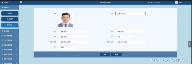 管理员可以查看系统用户(管理员、员工用户、部门负责人)列表中某一用户的详情,可以对用户信息进行查询、重置、添加和删除操作。其中部门负责人账户由管理员添加。其界面如下图4-14所示。